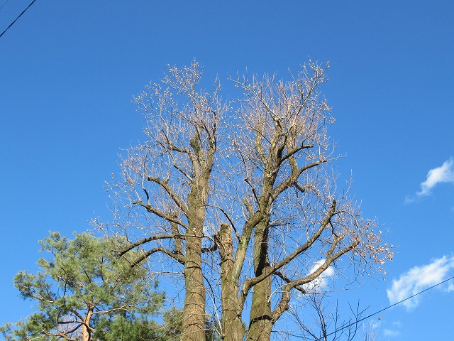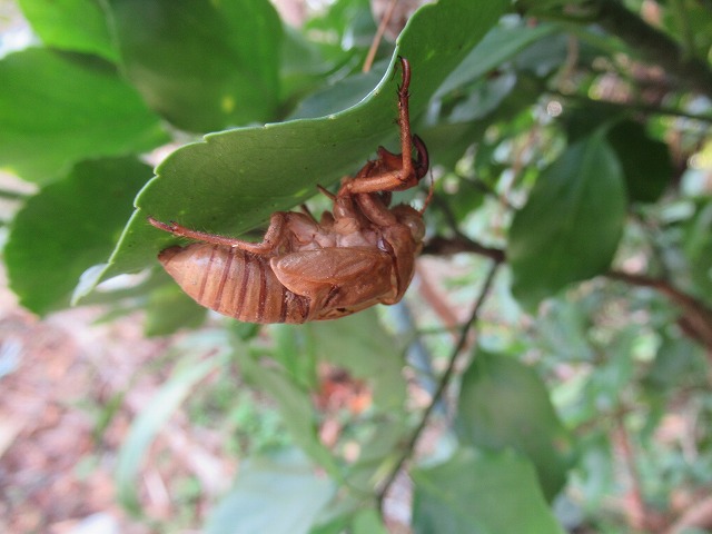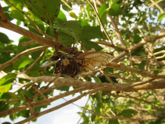 上向きの枝に、横向きの枝にと複数いる。もちろん夏の終わりに命は絶えているのだろうが、枝の下にさかさまの状態でもしっかりと留まっている。幼虫の抜け殻もそうだが、夏が終わってからもう4か月以上経つのに落ちないですごいものだ。 その間雨や風の日もあったろうに、即身成仏の姿よろしく泰然と動かず、かつ落ちないことに感心しきりだった。 1月19日(月曜日)