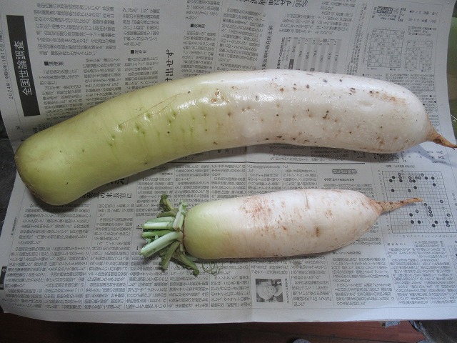 これが曇って寒い日になるとみごとにまったく姿を見せない(中の写真)。 何とか冬を越せるだろうか? ドキドキしながら日々眺めている。 大きい方はみごとに育ってふくよか。煮物や朝の味噌汁に入れて頂いている。小さい方は大根おろしにし、ちょっとポン酢をかけて。飛び上がる辛さで頭の芯まで目覚めさせられた感がした。 1月22日(木曜日)