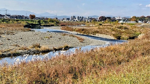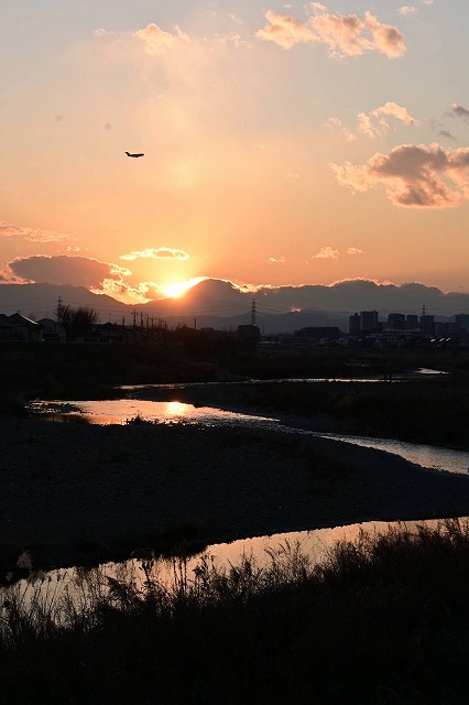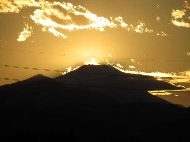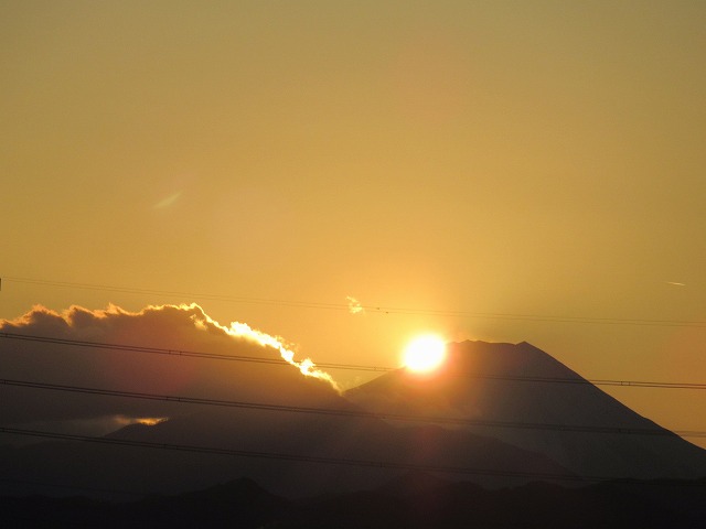 写真では富士山の左(南)のふもとに沈んでいるが、すぐに駆け上がって頂上付近に近づいていく。 それにしても、同じ場所からの写真でも昼間と日の入り時刻ではずいぶんと印象が違うことだ。川面に写る夕日も神々しい。